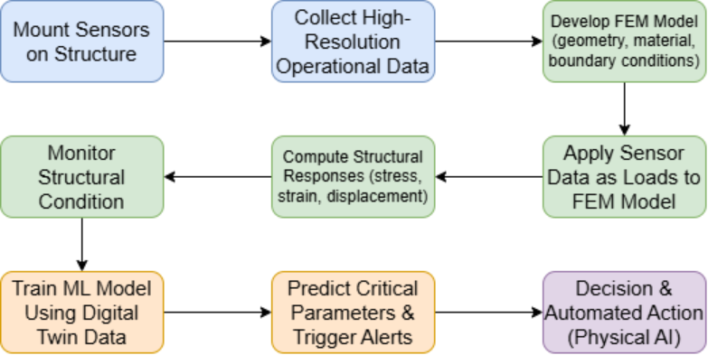 The flowchart in Figure 1 summarizes how sensors and FEM can be combined to develop a digital twin for SHM, highlighting the potential of leveraging ML for predictive maintenance and Physical AI for automated monitoring.