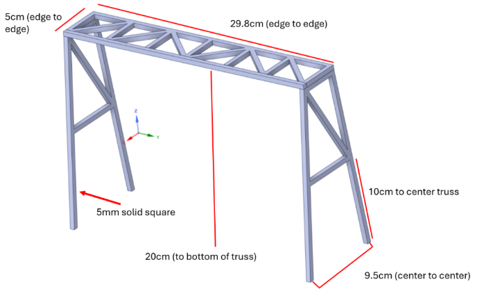 To demonstrate a practical, data-driven digital twin workflow, a small-scale structure resembling a cargo crane with a height of 20 cm and a span of 29.80 cm was 3D-printed as displayed in Figure 2.