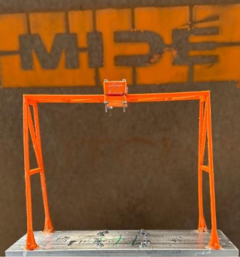 - Geometry and material modeling – The model consists of 5mm square sections which create a simplified gantry crane design. The CAD model was 3D printed using ABS material. The print was done with 100% infill as any infill percentage would not be able to be modeled in the finite element analysis properly. For the finite element analysis, the material properties of ABS (Youngs modulus of 348 ksi and poison ratio of 0.41) was used.