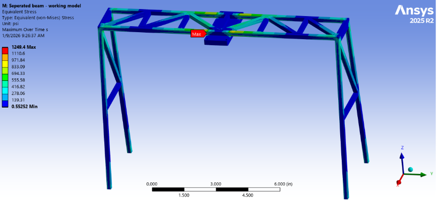 One of the most important aspects of a digital twin model is the ability to see the operational stress and strain that was put on the structure. These operational loadings can then be used by the engineers to better predict the characteristics of the structure. In the crane example, when the displacements in the FEA match those seen on the structure and proper boundary conditions and material properties are applied, the stress and strain in the model accurately reflect reality. By placing the displacements into the FEA, stress and strain values can then be found at any location, not just where sensors are located, as shown in Figure 7. It should be noted that the stresses predicted by the FEA are lower than the material strength, which is consistent with the experimental observations, as no cracks or structural failure were detected during testing.